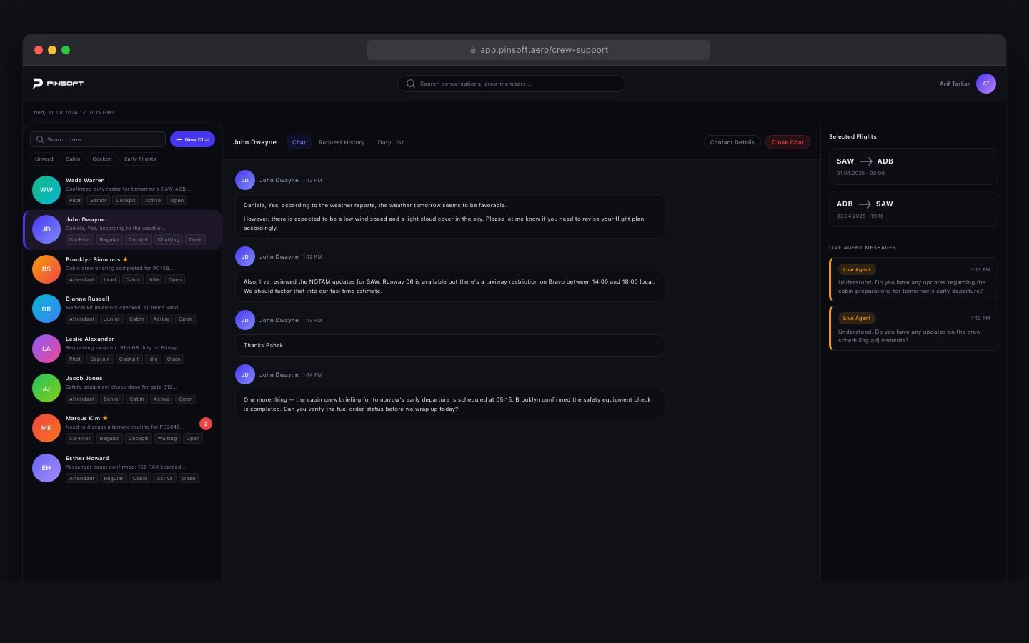 AI-powered crew support system that helps flight teams get answers faster through chatbot assistance, request workflows, live support escalation, and self-service policy guidance — while reducing support center workload.