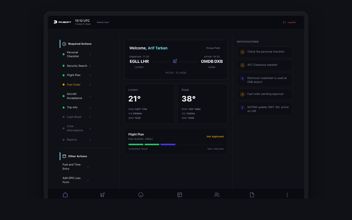 Operational workspace for flight crews to review plans, monitor weather and NOTAM changes, access digital documents, and stay aligned from pre-flight to arrival.