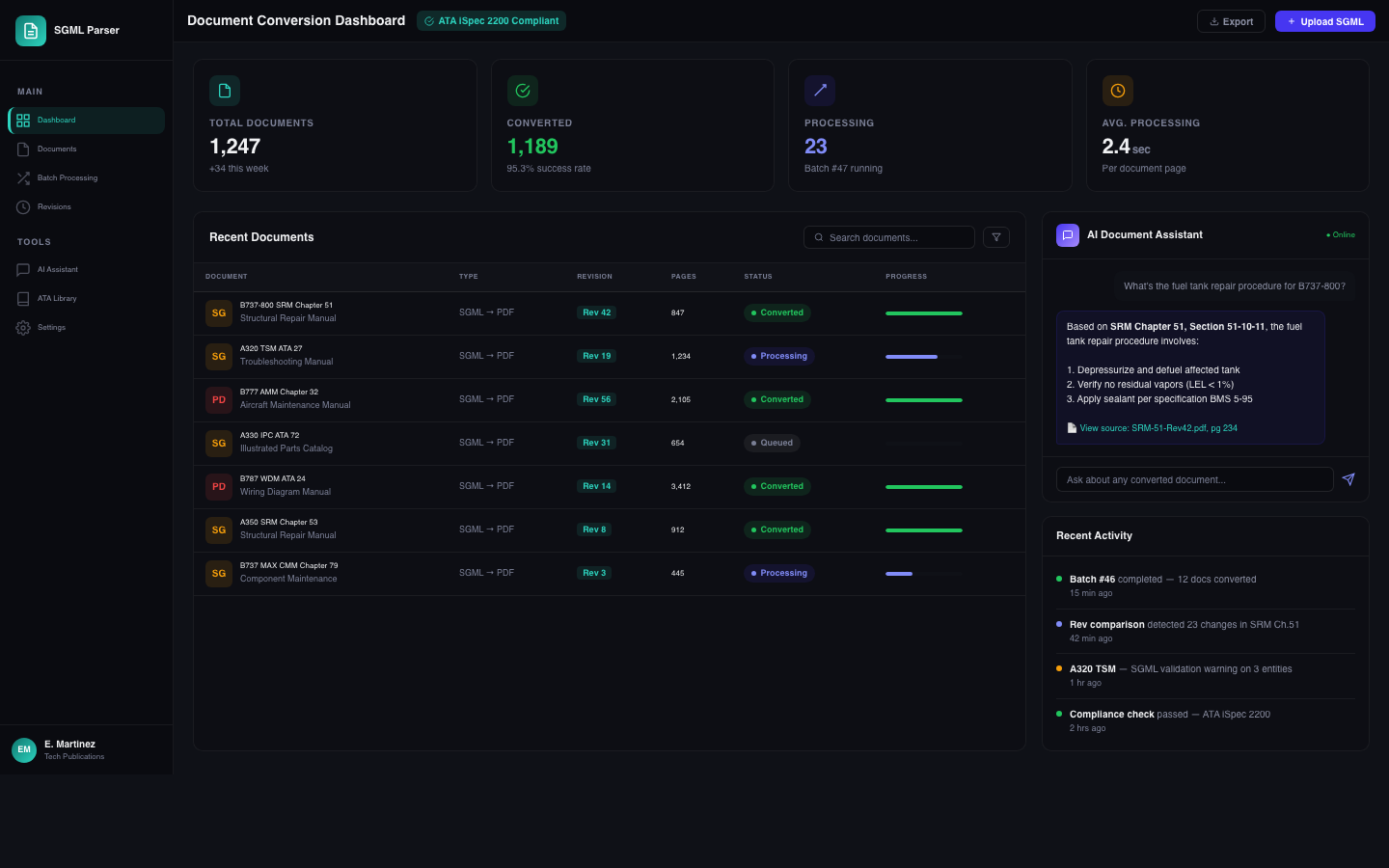 Converts complex manufacturer SGML documents into searchable PDFs while preserving structural hierarchy.