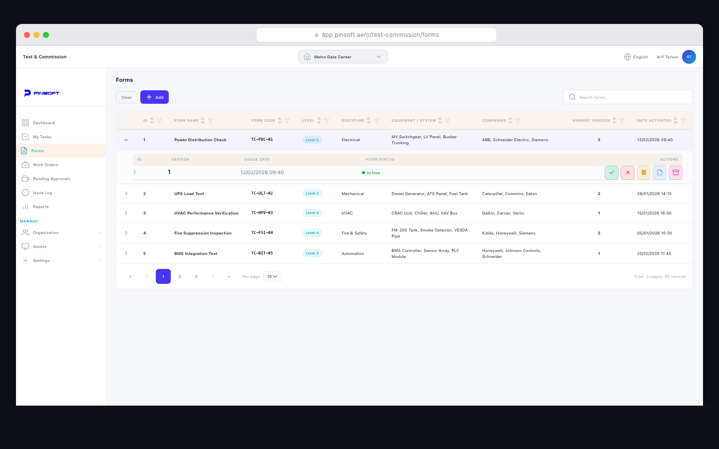 Manages Level 1-5 testing through structured digital checklists, field inputs, and execution records.
